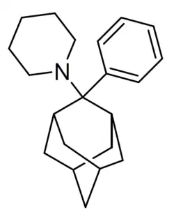 - ^ Eaton TA, Houk KN, Watkins SF, Fronczek FR (April 1983). "Geometries and conformational processes in phencyclidine and a rigid adamantyl analogue: variable-temperature NMR, X-ray crystallographic, and molecular mechanics studies". Journal of Medicinal Chemistry. 26 (4): 479–86. doi:10.1021/jm00358a005. PMID 6834381.