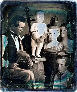 The daguerreotype found in the collection of the Ames family is singularly exceptional in that it shows the sculptor surrounded by several of his creations while working on another.[9] Asa Ames is seated at the left, working on a new bust located between his legs (now believed, based on studies of its profile and of Ames's own image, to be his self portrait held in the collection of the Huntington Museum of Art) while behind him at center is the top of a viola and four additional sculptural works on display. They include his sculpture of a naked child (here draped and holding an object in its right hand), his study of a hand holding a book and two portrait busts, one depicting a young boy and the other a young girl. In the lower right foreground is the mysterious image of another young man, perhaps a member of the Ames family.