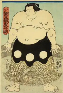 During the events of the Boshin War in 1868, Asahidake briefly left his stable to fight alongside the Sakai clan in the Battle of Toba-Fushimi, during which he served as a banner-bearer for his patrons.[3] In 1877 he was finally promoted to ōzeki, but only held the rank for two tournaments before retiring as a wrestler. After his retirement he remained within the sumo association and devoted himself entirely to training his wrestlers. In 1878, when he visited his hometown Yamagata on a regional tour, the prefectural governor at the time, Mishima Michitsune, arranged for the Gojō family to grant Asahidake a yokozuna licence, allowing him to perform a yokozuna ring-entering ceremony.[2] However, as Asahidake was not licensed by the Yoshida family, he is not counted among the list of official yokozuna.[3] For some time, Asahidake hoped to obtain an official licence from the Yoshida family, but without success.