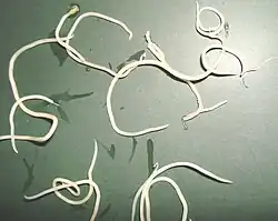 Ascaridia galli is a parasitic roundworm belonging to the phylum Nematoda. Nematodes of the genus Ascaridia are essentially intestinal parasites of birds.[1] A. galli is the most prevalent and pathogenic species, especially in domestic fowl, Gallus domesticus. It causes ascaridiasis, a disease of poultry due to heavy worm infection, particularly in chickens and turkeys. It inhabits the small intestine, and can be occasionally seen in commercial eggs.[2]