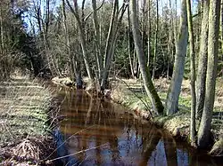 After leaving the Loher Ponds, the Aschau picks up the Dallebach and flows in a generally southerly direction, first through the Aschau Ponds. It passes under the B 191 federal road, is joined from the left by the Postmoorgraben, and then flows through extensively managed meadows and natural, original forest to Eschede, before continuing to Habighorst. It then picks up the Quarmbach from the right, a stream which rises in Rahmoor, and which forms a large swamp and lake area just before its confluence with the Aschau. Just north of this area is the Hoppenrieth Nature Reserve.[3] By the 15th century the Quarmbach had been impounded to drive the local mill, the Quarmühle and some of the ponds must date back to that period. In the 1980s the mill fell into disrepair and later burned down. The Aschau continues past the abandoned Mariaglück potash mine.[4] and on to Höfer. It flows south through Beedenbostel and discharges shortly afterwards into the Lachte.