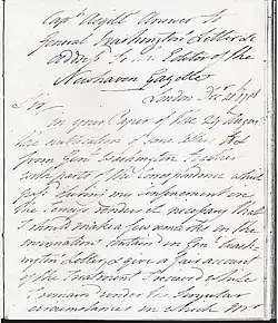 In response to what Tilghman reported, Washington ordered that his correspondence on the Asgill Affair be made public.[47] Colonel David Humphreys, Washington's aide-de-camp, gathered correspondence in support of him and created an article to send to Josiah Meigs and Eleutheros Dana, publishers of The New Haven Gazette and the Connecticut Magazine, where they were published on 16 November 1786.[48][49] These letters excluded Washington's letter written to General Hazen on 18 May 1782, ordering him to include conditional prisoners in the selection of lots, in which he had violated the 14th Article of Capitulation.[17] The only letter from Asgill included in Washington's account published in The New Haven Gazette and Connecticut Magazine was his letter of 17 June 1782,[50] in which he expressed his gratitude for the treatment he had received in Chatham, but this was printed with the date of 17 May (which was before lots were drawn).[48] When writing it, Asgill was only just three weeks into his confinement.