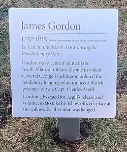 In his review of General Washington's Dilemma by Katherine Mayo, entitled "Only one hero – Major James Gordon", Keith Feiling writes that Mayo's book is, in some ways, a novel and as such deserves a hero. He maintains that the hero is neither Washington, Asgill, or Huddy, but rather James Gordon.[69] A memorial stanchion for Gordon stands at Trinity Church, New York, mentioning his advocacy for Asgill's release.[70]