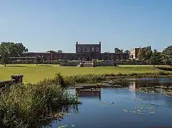 The park, covering some 200 acres (0.81 km2) and including three large lakes around the house, was laid out by the landscape architect Capability Brown in the mid-18th century. Brown's orangery, c. 1767, houses the oldest camellia in England.[4] Brick external additions were made to the house in Gothic Revival style in 1813–17,[1] by a third John Ashburnham, the second earl of Ashburnham, to designs by George Dance the Younger. Robert Adam designed entrance lodges for the second Earl in 1785.[5] George Ashburnham, 3rd Earl of Ashburnham, commissioned architectural drawings from John Soane, but it is not known if the suggested additions, including a porte-cochere, were built. The house was refaced in stone in the early 19th century, and then, when fashions changed, a second, red brick outer skin was added in 1853.[6]