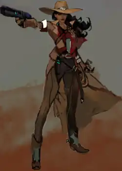 Concept artist JungAh Lee sketched several basic concepts, taking inspiration from biker gangs, vampire hunters, and cowboys,[2] as well as the anime Trigun.[5] While Hill felt it hit the mark he was going for, it didn't quite work as a character for Overwatch, describing it as "more of a gothic look and you would expect her to be hunting vampires or werewolves, or something like that", and upon stepping back realized that she resembled another character in the series, Reaper, in terms of silhouette and color palette. Hill suggested she try more freeform ideas with the design, and several others followed, including a woman of color in a brown duster Hill felt was too similar to Cassidy, a woman with a long red ponytail and spiked attire he felt was too punk, and a woman clad in white with a long flowing poncho he liked, but felt it made her resemble a superhero.[1] At this time art director Arnold Tsang also weighed in, feeling that the combination of pale skin with white hair made her seem vampiric, and that the cowboy aesthetic overall belonged more to Cassidy, suggesting instead to emphasize her biker aesthetic.[3] They started instead taking elements from her previous designs and working them into her finalized appearance,[1] with a focus on giving her class with a menacing edge to set her apart from Cassidy. Artist Ben Zhang also helped develop tech concepts for her character, which the team felt solidified her better into Overwatch's setting.[3] In addition, her hair was shortened, to help reduce workload and complications from animating long flowing hair.[1] B.O.B.'s design on the other hand changed very little during development, with the team loving the idea of a "burly, mustached omnic in a bowler hat".[6]