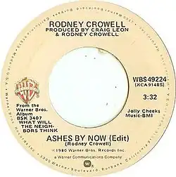 "Ashes by Now" is a song written by Rodney Crowell. It has since been recorded several times by various musical artists in the country music format. The song was first recorded by Crowell himself, eventually releasing it as a single in 1980.
