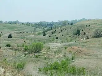 The first hint of the site's richness was the skull of a juvenile rhinoceros noticed in 1971 eroding out of a gully at the edge of a cornfield. In 1971, University of Nebraska State Museum paleontologist Michael Voorhies was walking with his wife Jane through a series of gullies on Melvin Colson's farm in northeastern Nebraska and made this discovery.[7][8] The Nebraska Game and Parks Foundation purchased the Ashfall site in 1986.[9] Ashfall Fossil Beds State Historical Park opened in 1991.[8] The site was declared a National Natural Landmark on May 9, 2006.[10]