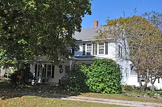 The five-bay front facade has two flat Doric pilasters and two more pilasters, located off the central bay support the broken base pediment.[3]: 5 The original door was replaced with a 19th-century door that has a 20-pane fanlight and is flanked by two flat pilasters that support the broken base pediment over the door. The main house originally had two-chimney design and another chimney was added to the east wall for a 20th-century furnace. Most of the windows in the house were replaced in the 19th century with 2-over-2 sash, except for two attic windows of each end of the gable which retain the smaller paned sashes.[3]: 2 The house includes an earlier 1+1⁄2-story ell in the rear that appears to have been a two-room central chimney structure that was integrated into the design of the main house and built in the second quarter of the 18th century.[3]: 2, 4 The chimney was replaced in the 19th century. A storage shed also sits behind the house. The property also had a dairy barn that was rebuilt following its destruction in the 1938 New England hurricane.[3]: 2