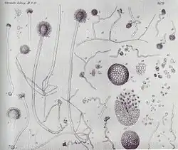 Botanical reference to this fungus seems to begin with Micheli, who in 1729 used the generic name Aspergillus, derived from aspergillum (holy water sprinkler) to describe the filamentous nature of this group of fungi.[6]