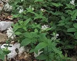 The plant is a medium-sized herb that grows to heights of 20–60 cm and has an erect, hairy stem. The leaves grow in whorls of four and are lanceolate to oval, with a length of 3 cm and a width of over 4 mm. The flowers are white with corollas over 8 mm long and grow in dense bunches at the end of a branch.[5]