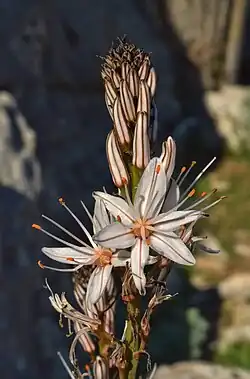 Asphodelus ramosus, the branched asphodel, is a perennial herbaceous plant in the order Asparagales. Similar in appearance to Asphodelus albus and particularly Asphodelus cerasiferus and Asphodelus aestivus, it may be distinguished by its highly branched stem and smaller fruits.[1][2] There has been a lot of confusion over the nomenclature and taxonomy of the species, owing to its similarity to Asphodelus aestivus.[3][4]