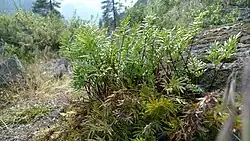 Aspidotis densa is a regional ecologic indicator on areas where ultramafic rocks (serpentine) are patchy, such as the Klamath and Siskayou Mountains of northern California and southwest Oregon and the Wenatchee Mountains of Washington.[4] Areas of serpentine soil can typically be seen as areas with sparse plant coverage or open forest bounded by closed forest on the non-ultramafic soils, with Aspidotis densa concentrated in the serpentine areas.[7][8]