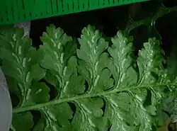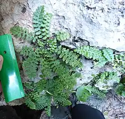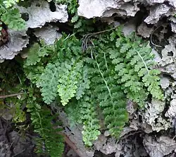 A small (4–7 cm), mid-green fern with centrally-radiating small fronds divided into close oblong leaflets with deep lobes giving a very crinkly look to the fern, the middle leaflet bases not stalked but join the frond axis broadly (on the upper half of the leaflet base), the frond stalks are short, black on the underside (the whole frond and axis green upperside), and the fronds droop down when growing on the sides of rocks. The sori under the leaflets are linear, close to the leaflet axis.[2][3]