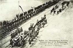 Delayed by fog, the Amphitrite arrived in Athens on March 27 just before noon. The high dignitaries of the court and the kingdom awaited the ship at the dock to pay their respects to the monarch's remains. As the coffin was disembarked, the batteries fired salvos. George I's body, as in Thessaloniki, was placed on a cannon carriage and pulled by Greek sailors. Constantine I followed the coffin, preceded by the Holy Synod. The procession included princes, the Lutheran minister, ministers, foreign consuls, and civilian and military authorities. Queens Olga, the widow of George I, and Sophia, the wife of Constantine, along with the princesses of the royal family, followed in carriages.[65]