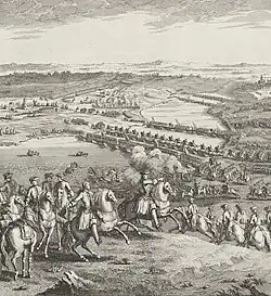 On 26 November, Marlborough, bolstered by reinforcements from Prince Eugene, who had diverted as many troops as he could spare from the siege of Lille, advanced swiftly from Kortrijk. The Allies then forced the line of the Scheldt River at two key points: Kerkhoff and Gavere. The troops crossed the wide river using pontoon bridges, catching the French completely by surprise, which resulted in minimal resistance.[12] In the ensuing confusion, the French retreated in disarray, pursued by Dutch cavalry under Lord Albemarle. The French suffered over 650 casualties, while the Allies sustained fewer than 200 losses.[13]