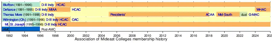 The Association of Mideast Colleges was a short-lived NCAA Division III conference composed of member schools located in the Midwestern United States. The league existed from 1991 to 1996.[1]