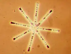 Asterionella is a genus of pennate freshwater diatoms. They are frequently found in star-shaped colonies of individuals.