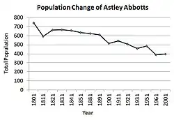 From using census data from 1801 to 1961 found on the Vision of Britain Website[8] and the 2001 census data found on the Office for National Statistics website,[1] it can be seen that Astley Abbotts has had a decreasing population. This can be seen from the decrease of 148 individuals from 1801 to 1811.[8] Astley Abbotts did also have an increase in population, between 1811 and 1831 when the population increased by 74 individuals.[8] However, after 1831 the population continued to gradually decrease, until 1901, by 152 individuals.[8] From 1901 to 1961 the population continued to decrease by 127 individuals creating a population of 387 individuals in 1961.[8] However, from 1961 to 2001 there was a small increase of 9 individuals, creating a total population of 396 people.[1]