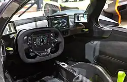 The interior design was leaked online on 20 June 2017 and gave a preview of the car's design. The interior has no gauge cluster, but rather a collection of screens. By the left and right corners are the screens for the camera side mirrors. One screen sits at the top of the center console, which may have a collection of live vehicle information, and regular vehicle controls, but this is not confirmed. A screen is used on the race-inspired steering wheel and acts as the driver gauge cluster. Dials and switches sit beside the wheel screen to allow for easier changes without driving interruption. The seats, formed from hollow carbon fibre straight into interior perimeter, are bucket variants, and have two seat belts for each car seat.[21]