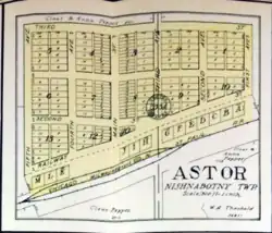 Astor was platted on the Chicago, Milwaukee, and St Paul Railroad in 1882 by Alexander Liedlum. Astor had a Methodist church, a school, a grain elevator, and a general store which also served as the post office. The town grew quickly, but railroad officials set the junction of the rail line two miles northeast, to nearby Manilla. Many residents in Astor then moved their houses to Manilla, pulling them on horse-drawn skids. The community was slowly abandoned.[3]