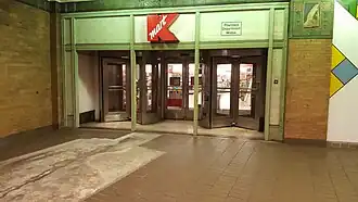 On the southbound side, the station has an entrance and windows into a store. The heavy brick-faced square columns on the southbound platform support the store above.[4]: 4–5 The store was originally constructed in 1868 as an A. T. Stewart, but it had become a Wanamaker's by the time the station was constructed and opened.[4]: 4–5 [9]: 94 The Wanamaker's store was closed by 1954. It served as Kmart location from November 1996 to July 2021.[67][68] A Wegmans location opened within the Kmart space in late 2023.[69]