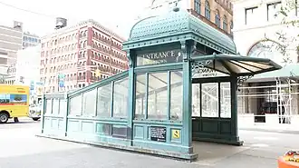 The northbound platform's entrance is in the traffic island bounded by Fourth Avenue, Lafayette Street, and Eighth Street.[71] Unlike the southbound entrance, the northbound entrance contains a highly decorative entrance, reminiscent of an entry kiosk seen on the original IRT.[4]: 7 The structure is an imitation of the IRT's original entrance and exit kiosks, extremely ornate structures made of cast iron and glass. The IRT kiosks were inspired by those on the Budapest Metro, which themselves were inspired by ornate summer houses called "kushks".[72]: 443 [73]: 66–67 The Astor Place entrance is a reproduction installed in the 1980s and was made at the same factory as the originals.[4]: 7 [51] The kiosk is 13 feet (4.0 m) wide, 22 feet (6.7 m) long, and 16 feet (4.9 m) tall.[51] The replica was largely based from photographs by renovating architect Rolf Ohlhausen.[43]: 81 Like the original entrance kiosks,[59]: 13 it has a domed roof with cast-iron shingles.[4]: 7 [51] Unlike the originals, the roof of the kiosk have clear tempered glass to allow natural light, while the original kiosks had translucent glass with chicken wire, which tended to become dirty over time. Additionally, the decorative pieces of the new kiosk were molded from fragments of the originals, but the new kiosk was made of lighter-weight material.[43]: 81