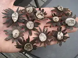 This earthstar has been used in traditional Chinese medicine as a hemostatic agent; the spore dust is applied externally to stop wound bleeding and reduce chilblains.[63] Two Indian forest tribes, the Baiga and the Bharia of Madhya Pradesh, have been reported to use the fruit bodies medicinally. The spore mass is blended with mustard seed oil and used as a salve against burns.[64] The Blackfoot of North America called the fungus "fallen stars", considering them to be stars fallen to the earth during supernatural events.[65]