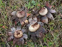 Astraeus hygrometricus is an ectomycorrhizal fungus and grows in association with a broad range of tree species.[45] The mutualistic association between tree roots and the mycelium of the fungus helps the trees extract nutrients (particularly phosphorus) from the earth; in exchange, the fungus receives carbohydrates from photosynthesis.[39] In North America, associations with oak and pine are usual,[18] while in India, it has been noted to grow commonly with chir pine (Pinus roxburghii) and sal (Shorea robusta).[39] The false earthstar is found on the ground in open fields, often scattered or in groups, especially in nutrient-poor, sandy or loamy soils.[28][33][34] It has also been reported to grow on rocks, preferring acid substrates like slate and granite, while avoiding substrates rich in lime.[46] In Nepal, fruit bodies have been collected at elevations of 3,000 m (9,800 ft).[47] Fruit bodies typically appear in autumn, although the dry fruit bodies are persistent and may last up to several years.[32] Gelatinipulvinella astraeicola is a leotiaceous fungus with minute, gelatinous, pulvinate (cushion-shaped) apothecia, known to grow only on the inner surface of the rays of dead Astraeus species, including A. hygrometricus.[48]