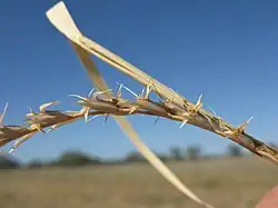 Astrebla lappacea, commonly known as curly Mitchell grass, is a herb of the family Poaceae from the order Poales. It grows to 0.9 metres (3 ft) tall. Named in honour of Thomas Mitchell, the Latin specific epithet of lappacea is derived from lappa meaning with burrs.[1] The most common of the Astrebla species, it is a widespread Australian inland plant. It is often seen on floodplains and heavy self-mulching clay soils, and flowers in response to rain or flooding. This grass is palatable to livestock, even when dry.[2][3][4][5]