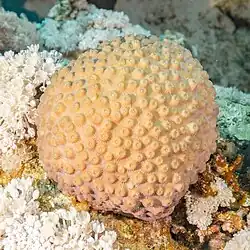 Members of this genus occur in the Red Sea, the Indian Ocean and the western Pacific. They are widespread but not particularly common and are a reef building species.[2] They are found in a range of environments including shallow or muddy waters, as well as deeper areas of the reef where plating forms are most common.[1] In shallow water they are inconspicuous and are never dominant. They may form heads of up to two metres in diameter and in deeper waters they may be much more common.[3]