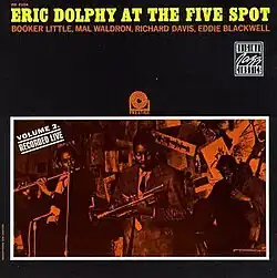 Eric Dolphy at the Five Spot is a pair of live albums by the jazz musician and composer Eric Dolphy. They were released in December 1961 (Volume 1)[1][2] and November 1963 (Volume 2)[3][4] through Prestige Records. They were recorded on the night of 16 July 1961 at the end of Dolphy's two-week residency, alongside trumpeter Booker Little, at the Five Spot jazz club in New York. It was the only night to be recorded. The engineer was Rudy Van Gelder.