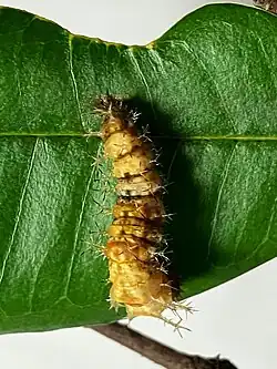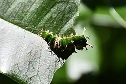 "In form the larva was exactly similar to that of Limenitis (Moduza) procris. ...; in colour it was green, with a whitish band round the 9th segment. Its habits were also like those of L. procris, but not quite the same. It selected one of the side nerves of a leaf and ate away the soft parts on each side till the bare nerve stood out; then having barricaded the approach to this with fragments of leaf which it had contrived to cut off in feeding, mixed with excrement and silk, it rested motionless on the very point of the rib unapproachable by ants or spiders. After the last moult it gave up these habits and rested on the upperside of a leaf, where it was conspicuous enough. We infer that the worst enemies of this species- are not birds or parasites but small spiders and predaceous insects." (Davidson & Aitken)[3]