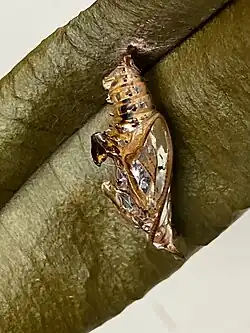Of the most brilliant silver colour, the segments and parts being outlined in brown. It is suspended perpendicularly; abdominal segments slender, the thoracic region larger and expanded laterally; two long sharp horns issuing from the sides of the head and at first parallel, diverge and point laterally; on the back there are two prominent processes curved towards each other, and many small points and tubercles. (Davidson & Aitken)[3]