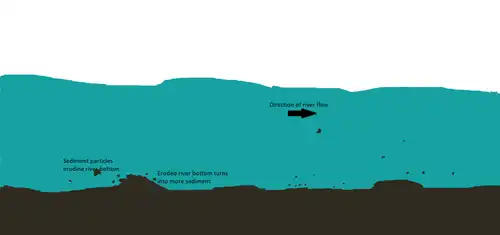 Generally, particles are more affected by attrition farther downstream, as the rivers' velocity tends to be higher, and therefore its competence (ability to carry sediment) is increased. This means that the load rubs against itself more and with more force when suspended in the river, thus increasing erosion by attrition. Although there is a point after transport over a certain distance that pebbles reach a size that is relatively immune to further attrition. Grain-size distribution of sediments produced by attrition will also be controlled by the lithology of the rock from which they are derived. Particle sizes generally decrease continuously as the river flows farther downstream, in a process called downstream fining.[6] Since attrition affects pebble size it also affects the movement of the pebbles, and the size and condition of pebbles can explain past conditions of waterways, such as flow.[7]
