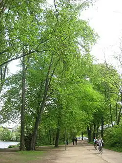 Almost all banks of the Außenalster are public. Formerly private gardens on the western side were made public while Hamburg was host to the Internationale Gartenbauausstellung (International Horticulture Show, IGA) in 1953. The banks vary from a small strip of green to large public parks (e.g. the Alstervorland). The 7.6 kilometres (4.7 miles)[3] long pathway around the lake is very popular for joggers.