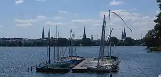 Außenalster (pronounced [ˈaʊsn̩ˌʔalstɐ] ⓘ) or Outer Alster Lake is the larger one of two artificial lakes, which are formed by the Alster River and are both located within the city limits of Hamburg, Germany. The other „lake“ is the Binnenalster. The Außenalster and its shores are used by the inhabitants of Hamburg for many sport and recreational purposes, such as sailing and rowing.