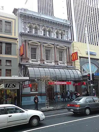 The Auckland Savings Bank Building is a Category I historic building located at 260 Queen Street, Auckland CBD, New Zealand. The building is recognised as the oldest intact bank building in central Auckland and a significant example of late 19th-century commercial architecture.[1] Constructed in 1884, it originally served as the premises of the Auckland Savings Bank. In 1977, the building was acquired by the newly established McDonald's New Zealand and converted into a fast food restaurant. It was the first McDonald's restaurant in Auckland and the second in New Zealand, after Porirua.[2] The restaurant closed in 2020 and relocated two doors down Queen Street.[3] In June 2023 McDonald's listed the building for sale. As of April 2024, it remains on the market.[4]