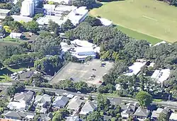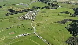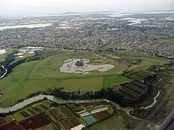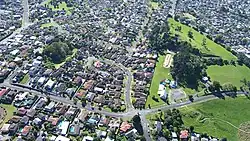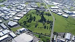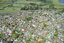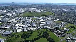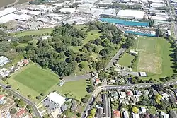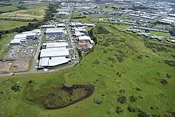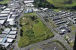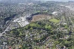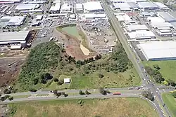 The buildings in the middle of the photo are on the site of quarried away Te Puke ō Tara / Otara Hill volcano, 2009