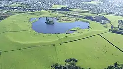 The field has produced voluminous lava flows that cover much of the Auckland isthmus. One of the longest runs from Mt Saint John northward, almost crossing the Waitematā Harbour to form Meola Reef.[10] More than 50 lava tubes and other lava caves have been discovered, including the 290-metre (950 ft)-long Wiri Lava Cave.[11] There can be an association with lava caves and the formation of rootless cones due to their mechanism of formation and a rootless cone was suggested to exist at Wiri being Matukutūreia.[12] This may not be quite the case even though at least one steam only driven eruption occurred close to Matukutūreia.[13] The second-longest individual cave in the Auckland field, some 270 metres (890 ft) in total length, is the Cave of a Thousand Press-ups to the east of Maungakiekie/One Tree Hill.[14] Two impressive depressions caused by lava cave collapses are the Puka Street Grotto and the nearby Hochstetter Pond, also known as Grotto Street Pond, in Onehunga.[15][16]