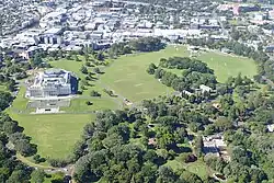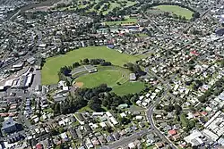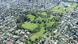 Site of Grafton explosion crater and tuff ring in 2018, completely covered in houses and medical School except for Outhwaite Park