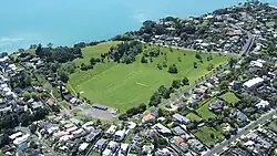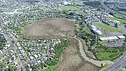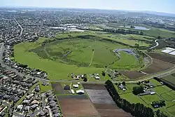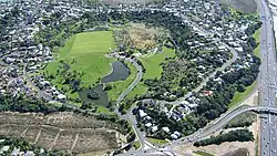 The Glover Park sports ground at lower right of this photo is situated within the Whakamuhu tuff ring. Over the water in the distance on the right is the scoria cone of Maungauika / North Head and in the left middle is the tuff crater filled in by the sea of Ōrākei Basin. Beyond Ōrākei Basin in the middle distance are several vegetation covered scoria cones.