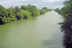 From Carcassonne, the river becomes calmer following the great tectonic furrow which separates the Pyrénées (Corbières) from the Massif Central (Montagne Noire), receiving from these heights a series of tributaries of which the main ones are the Orbieu on the right bank, and the Argent-Double and the Casse on the left bank. From this point, bordered by the Canal du Midi and sinuous amid vineyards, the Aude enters the broad alluvial plain of Narbonne with the main stream flowing to the Gulf of Lion and some waters diverted to a network of ancient ponds before flowing into the Mediterranean Sea .