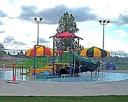 Shadle Park is the largest in the neighborhood at 40 acres and the most developed. Shadle Park is home to baseball, softball, basketball, tennis and track sporting facilities. It has a branch of the Spokane Public Library, a theater stage, gazebo shelters, picnic areas, treed lawns, and an aquatic center with a lap pool and water slides.[15] It is also the site of the neighborhood's iconic mid-century green and gold water tower.[16] The 27.6 acre Audubon Park, a community park, has baseball and softball fields, a playground, basketball court, wading pool, picnic area and treed lawns.[17] The 2.3 acre Webster Park, taking up one full city block, is a neighborhood park with a softball field, playground, and treed lawn.[18] Downriver Park is mostly undeveloped conservation land covering 95.3 acres along the Spokane River in the southwest of the neighborhood, with an 18 hole disc golf course.[19] Drumheller Springs is undeveloped conservation land that covers 12 acres.[20] Surrounded by the Downriver Park conservation area is the public, 18 hole Downriver Golf Course.[21]
