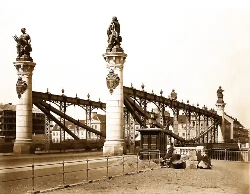 The current Augartenbrücke was erected in 1872/3 by the French compagnie de Fives-Lille using welded iron of Belgian origin, with a suspended frame and support chains, as well as a wooden deck. The official opening took place on 6 June 1873, during the Vienna World's Fair. The four granite pillars at each end of the bridge supported bronze allegorical figures of painting, poetry, industry, and astronomy.