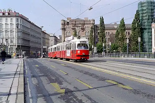 The centre of the bridge has lines of the Vienna tram service running in both directions. The northwest side of the bridge takes car traffic to the left, to the Upper Donaustraße, which runs along the side of the canal towards the Rossauer Brücke, while the southeast side of the bridge takes car traffic straight on onto Lower Augartenstraße. Line U4 of the Vienna U-Bahn runs underneath the bridge, replacing the line of the Vienna Stadtbahn opened in 1901.