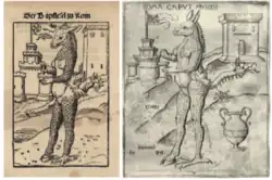 In general respects the images follow contemporary manuscripts, in particular Conrad Lycosthenes's Chronicle of Prodigies and Portents (1557) and the Histoires Prodigieuses by Pierre Boaistuau (1560),[2] and designs by contemporary painters and printmakers, including Hans Sebald Beham, Hans Holbein the Younger, Lucas Cranach the Elder and Albrecht Dürer.[8] The captions describe and/or comment on the images and, where appropriate, cite Biblical sources (from the Luther Bible of 1545) or the place and date of the event depicted.[2]
