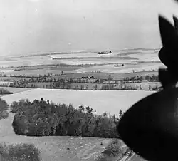 Seven Lancasters of 44 Squadron took off from RAF Waddington in mid-afternoon. Nettleton's force formed into two sections of three aircraft plus a spare and headed south. Ten miles to the east at RAF Woodhall Spa, seven more Lancasters headed south, with Sherwood leading his two flights of three plus a spare. The two groups did not link up, which was not troubling to either group. The sky was clear and the weather warm.[19] The 14 aircraft flew to Selsey Bill, a headland jutting into the Channel just east of Portsmouth that served as a prominent navigation point.[16] At Selsey Bill the back-up Lancasters turned back to their airfield. The remaining aircraft flew on, as they crossed the coast they made a hard 90 degree turn to the left and dropped down to 15 metres (50 ft) to cross over the English Channel. Nettleton's group were ahead flying slightly north of the intended flight path.[16] Sherwood spotted Nettleton's group as they approached the French coast, but Sherwood's navigator confirmed his position and course were correct, and he did not attempt to close the gap.[11] They reached the French coast at Dives sur Mer while the diversionary operation was well underway. Flying under German radar, the 12 aircraft moved inland unnoticed. Nettleton's group passed over Lisieux, where they came under anti-aircraft fire. Some aircraft were hit but no significant damage resulted. A little behind, Sherwood's group kept a flight path a little farther south. As the two "vic" formations of 44 Squadron approached Evreux they passed just to the east of the French airfield at Beaumont-le-Roger, which was in use by Jagdgeschwader 2. Unfortunately, through an error in orders issued to the Boston bombers and their escorts, the diversionary attacks had been run 40 minutes ahead of schedule. The German fighters that had been sent up to engage them were returning to base when Nettleton's aircraft passed by.[18] For a moment the Lancaster crews thought they had gone unnoticed, but several German fighters were seen to snap up their undercarriages and veered in their direction.[16]