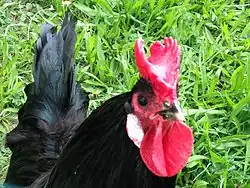 The Augsburger is well adapted to the climatic conditions of its area of origin, the Bavarian Plateau.[7] The usual plumage colouring is black, with greenish lights; after the Re-unification of Germany in 1990, a new colour variant, blue-laced, was added to the standard.[9] The Augsburger has an unusual cup-shaped or rose-comb, similar to that of the Siciliana breed of Sicily, and quite unlike the v-shaped comb of the La Flèche breed. The earlobes are white.[6]