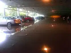 Daily rainfall records were broken in Detroit, Flint, and Saginaw, with Detroit recording its second-heaviest rainfall event when 4.57 in (116 mm) of rain fell at Detroit Metropolitan Airport on August 11.[4][5] Portions of Interstate 696 and Interstate 75 were closed as vehicles were submerged in floodwaters.[6][7] In suburban portions of Detroit, peak rainfall amounts of 6.25 inches (159 mm) were recorded.[8] The American Automobile Association received over 700 calls for assistance in 12 hours, and heavy rainfall caused river levels to rise.[9] At Baker College near Allen Park, floods stranded 60 students and forced a portion of Interstate 94 to close.[10] Detroit Zoo closed as a result of flood damage there.[9] There were 32,000 power outages during the flood event, and flood damage totaled $1.8 billion.[6][11] In excess of 100,000 homes were damaged across Macomb, Oakland, and Wayne counties as a result of the flooding.[5] Floodwaters across southeastern portions of the state were combined with nearly 10 billion gallons of sewer overflow.[12] The flooding in Michigan was described as a "1-in-500 year event", and also regarded as the largest United States natural disaster in 2014 by the American Red Cross and the Federal Emergency Management Agency.[5]