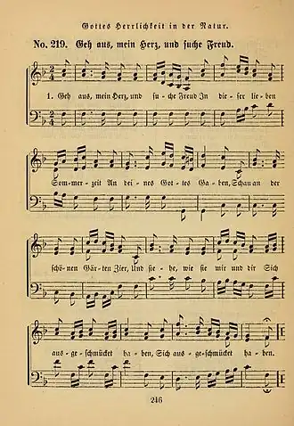 Harder composed singable melodies, of which the one to Paul Gerhardt's sacred summer song "Geh aus, mein Herz, und suche Freud" was of lasting popularity. Although church musicians disliked its melismas and merry character, and tried various other melodies with the text in hymnals, it is now part of the Protestant German hymnal Evangelisches Gesangbuch of 1993, as EG 503.[1]